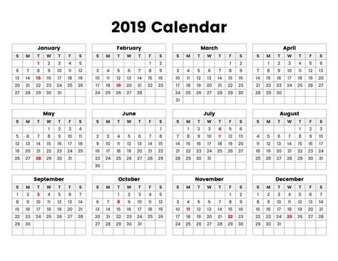 2019 Year Calendar. Web below are year 2019 printable calendars you're welcome to download and print. Web below is our united states 2019 yearly calendar with federal holidays highlighted in red and prominent holidays.